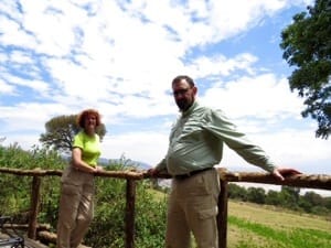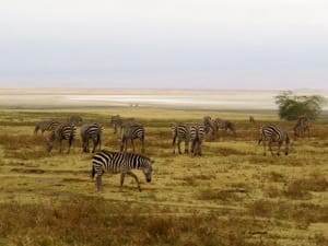 We drove up the winding rim road, stopping at the overlook (under construction) to view the scenic vistas on both sides. The overlook was crowded with vehicles like the entrance gate, and I was beginning to have some doubts about Ngorongoro Crater Lodge until we rounded the corner to find a herd of zebras grazing just outside the entrance to the courtyard.