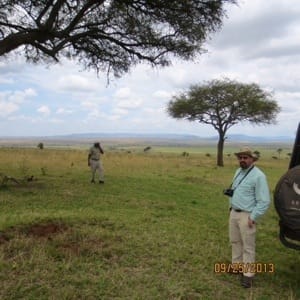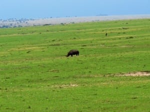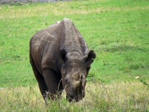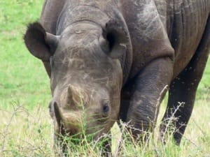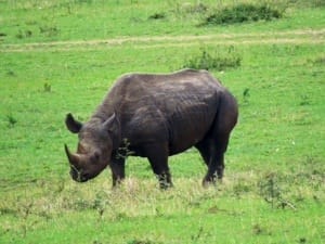 It was about 3:00, and we were starting back to camp, when Anthony heard from another driver of a rhino siting. We immediately sped off and found a single, male Black Rhinoceros browsing calmly in a field. There were several other vehicles parked near each other, and we took a position 90 degrees around the rhino from them. I took about 150 pictures of if from all angles. The rhino actually grazed in a circle around our vehicle away from the others. At one point, it was only about 50 yards away!
