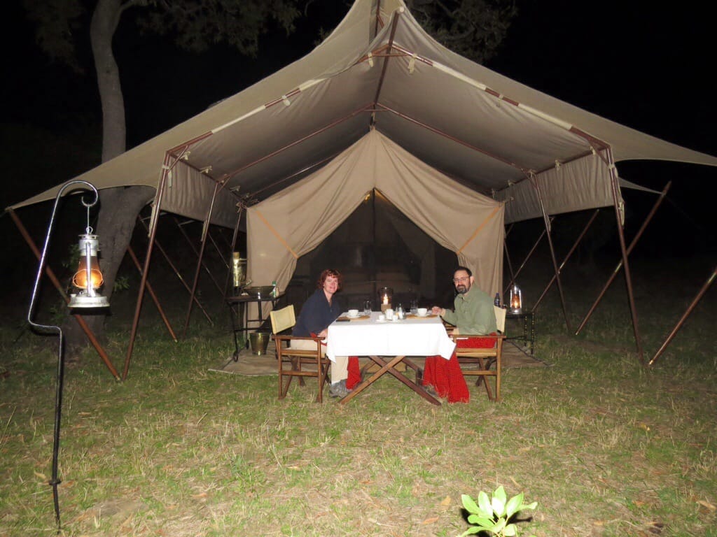 After we cleaned up, it was dark. We called Mauren on the walkie talkie to get an escort to the lounge tent to discover both the dining tent and several outside tables were set. There had been many new arrivals that day, and we were to dine at our tent that night. We sat by the Masai TV and discussed the plans for the morning. It seemed that another couple was flying out on the same plane with us, and Anthony wanted to coordinate our departure. The flight left Kogatende Airstrip at 10:25, and we wanted to be there half an hour early. He suggested leaving at 8:00 so we could get some game viewing on on the way. We agreed and set a 6:00 wake up call with tea and breakfast at 7:30.